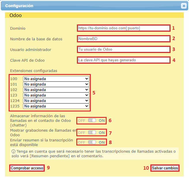 - Store call information in Odoo contact ➜ If it is active (ON) it allows to store a record of the incoming/outgoing calls.