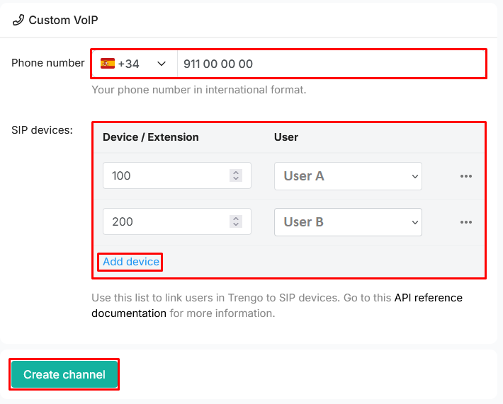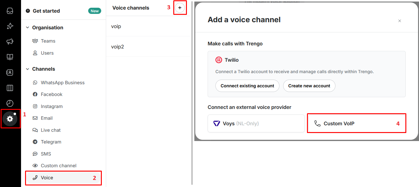 To create a channel, log in to your Trengo account as an administrator, click Settings > Channels > Voice > Click the (+) next to "Voice channels" > Select "Custom VoIP".