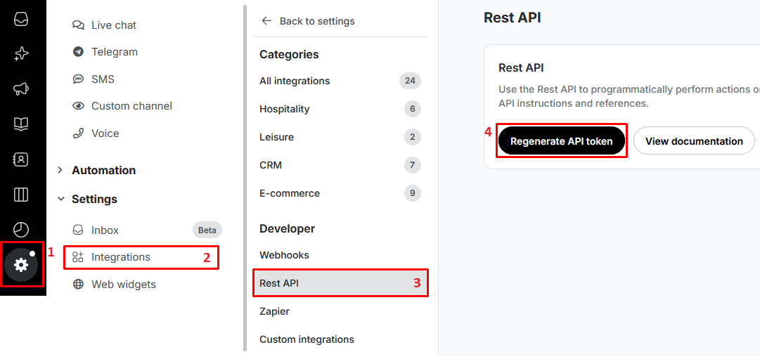 - Click on the menu option Settings > Integrations > Developer > Rest API > Generate API token.