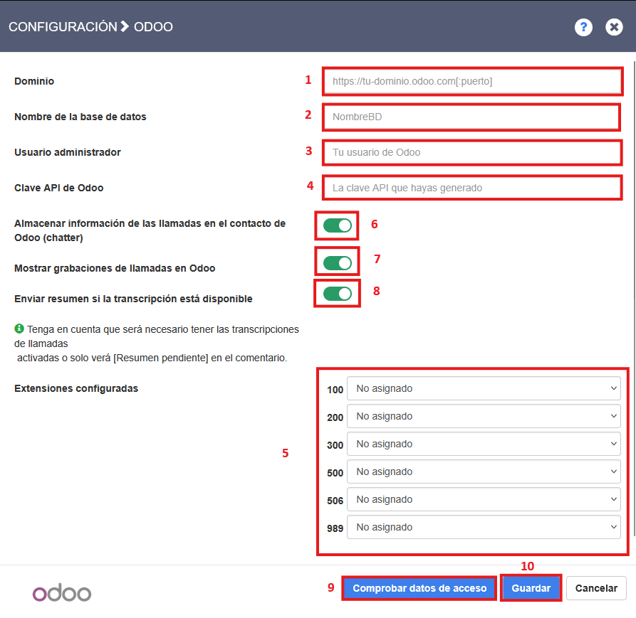 - Dominio ➜ URL de tu página de Odoo incluyendo el número de puerto si es necesario.