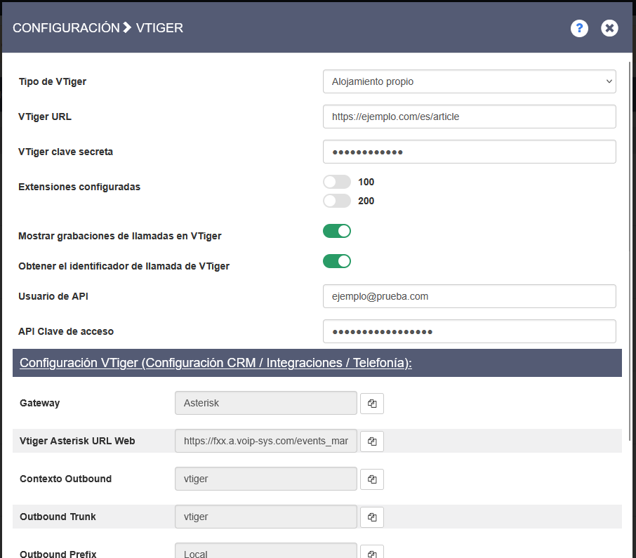 4. Configuración de VTiger en el panel de control de la centralita