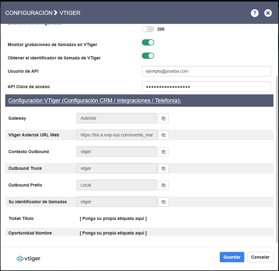 - Vtiger Secret Key: apunte estos valores ya que lo necesitará para configurar el apartado de VTiger de su centralita.