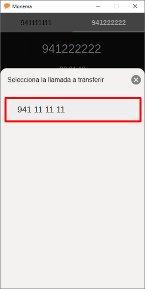 - Finalmente haga clic en el botón 'transferir' [🢚] y seleccione el número con el que desea transferir la llamada. Al hacerlo la llamada se colgará para usted, pero seguirá activa para los otros dos hablantes quienes ya estarán conectados a la misma llamada.